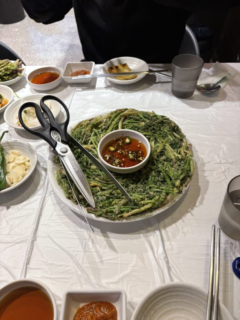 セリがそのままチヂミになってて、サクサクなんです!でね、この真ん中のたれも最高なんです。チヂミ自体があっさりしててバクバク食べれちゃう。